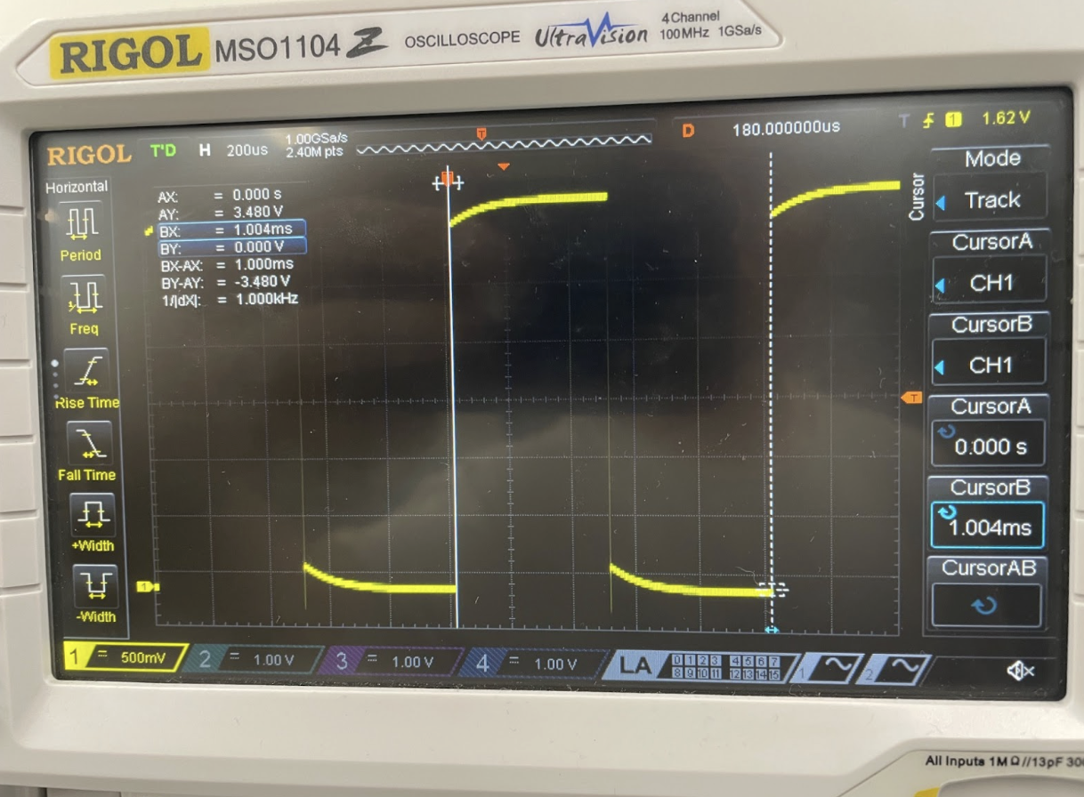 Plugging back in to see the actual frequency with \(ARR = 11428\): \[f_{TIM} = \frac{80,000,000}{(6+1)(11428+1)} = 999.9625 Hz\] Percent error: \[\% Error = \frac{|999.9625-1000|}{1000} * 100 = 0.00375 \% < 1 \% \] We can see that the error introduced by rouding from the ARR is way less than 1 %.