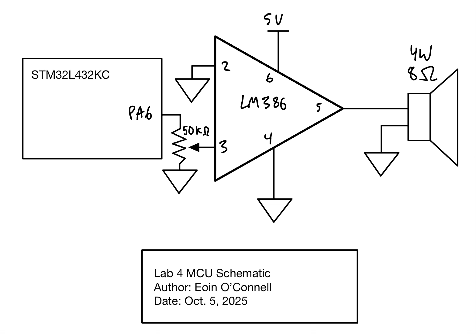 Finally, the amplifier output goes to a 8 W, 4 \(\Omega\) speaker.