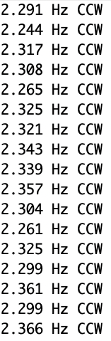 Here is an example output of what the MCU displays when the motor is running at around 10V. From the professor, we expect around 2 RPM at 10V. We can see that we are getting 2.2-2.3 RPM, so our motor is reading values that are reasonably correct. This shows that we are not missing edges and that we are getting accurate readings.