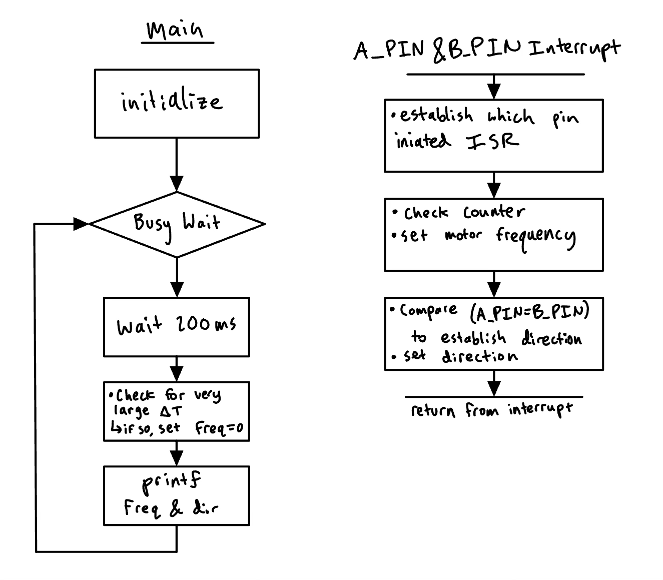 The primary challenges of this lab are in the setup of the interrupts themselves. There are 4 possible interrupts, a rising or falling edge at A, or a rising or falling edge at B. This gives us all the information we need to be able to determine both velocity and direction.